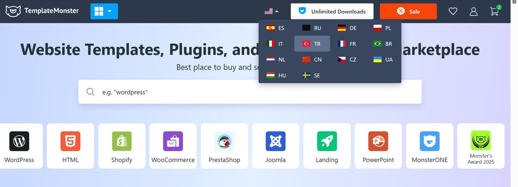 TemplateMonster.com arama kutusu türkçe görüntülense de sadece ingilizce kelimeleri arar.